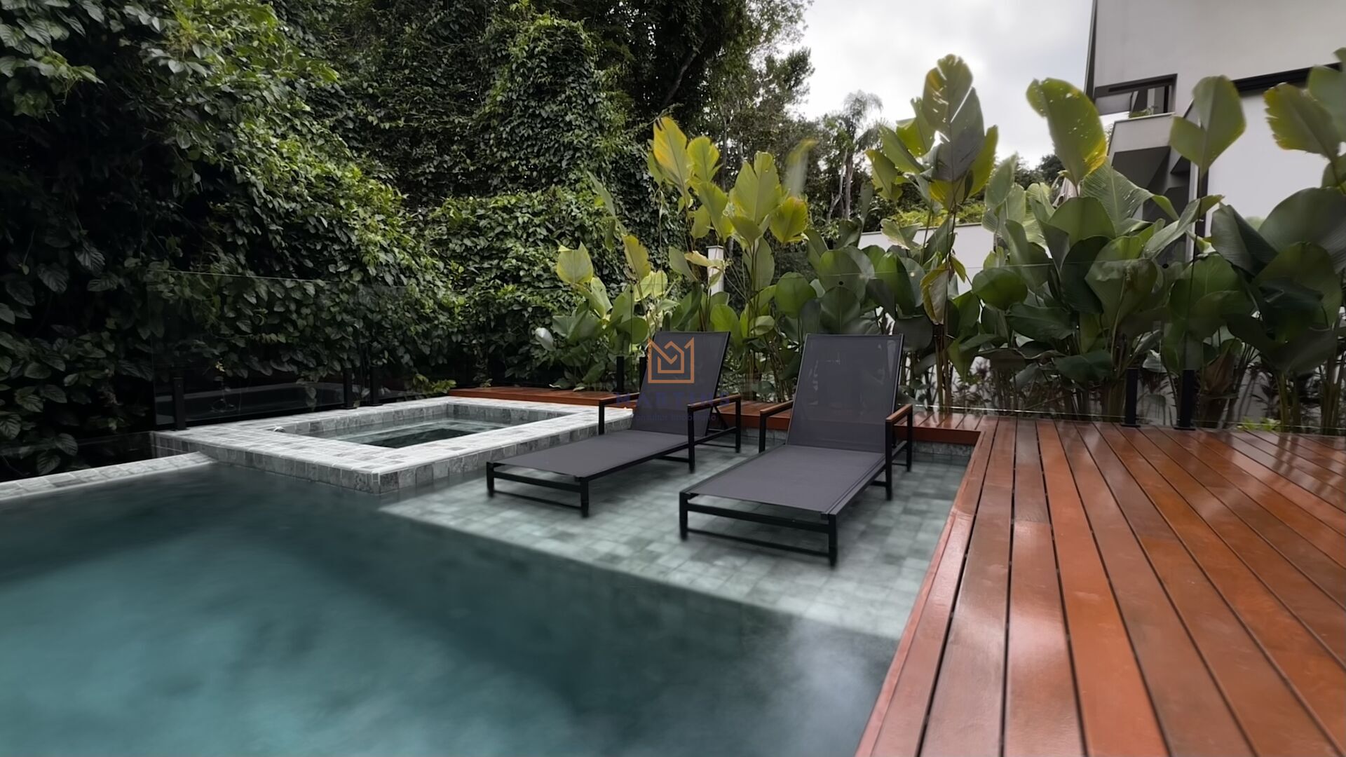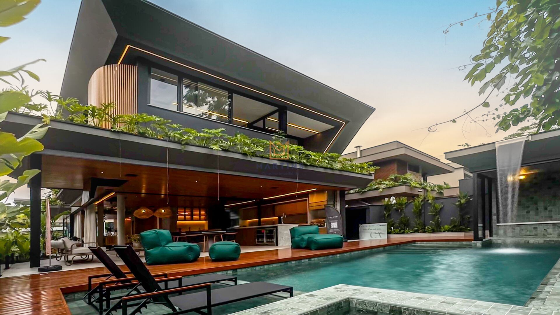 Com uma área construída de 455m², este lar possui diversos diferenciais, como cinema, lareira, piscina, sacada, sauna e varanda gourmet.