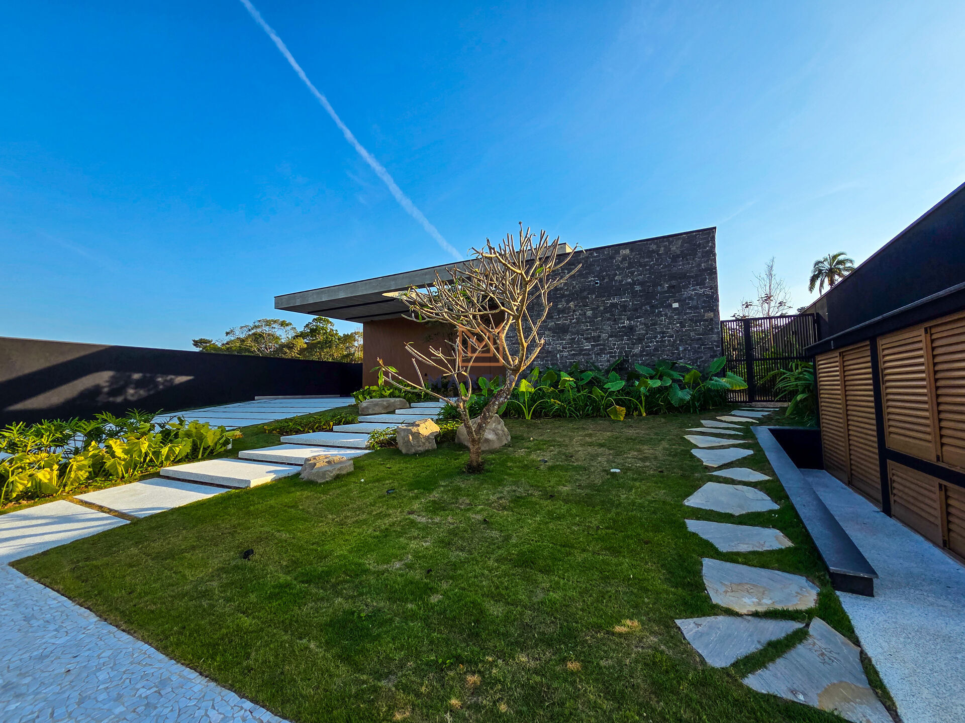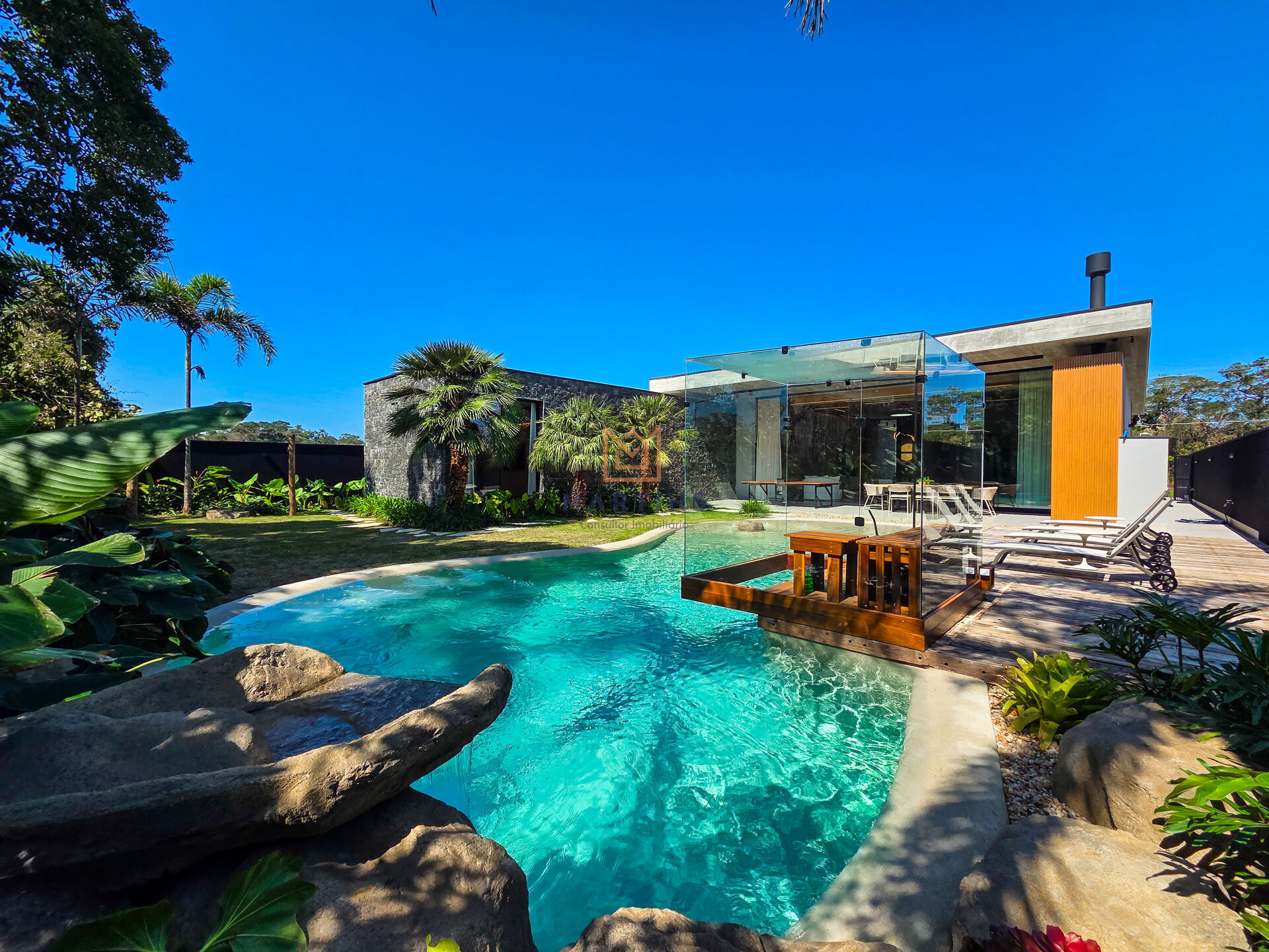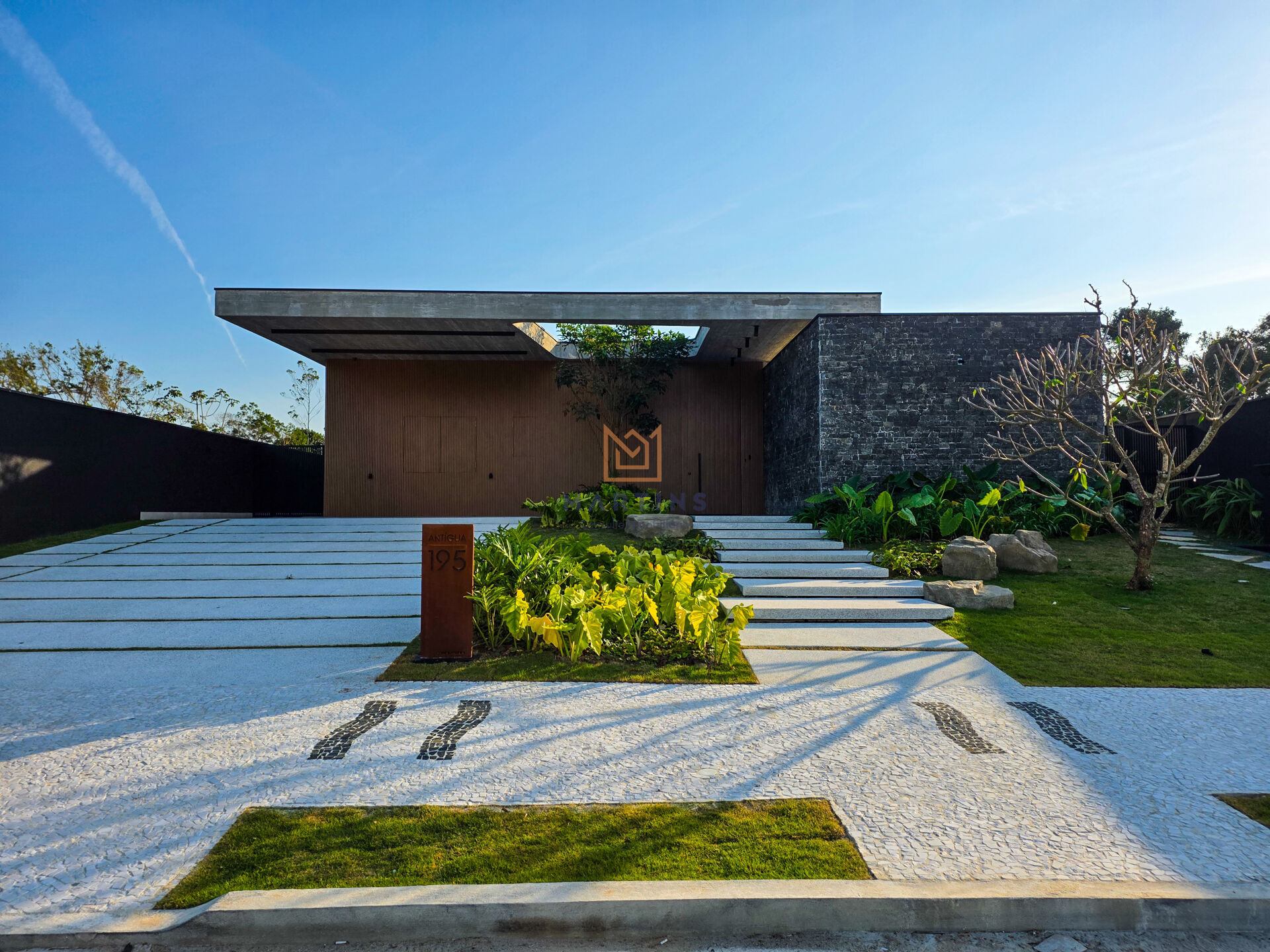- Tato: Sinta a nobreza das texturas – a robustez das pedras, a suavidade do concreto, a frescura da água na piscina, a maciez da relva e a areia convidativa.